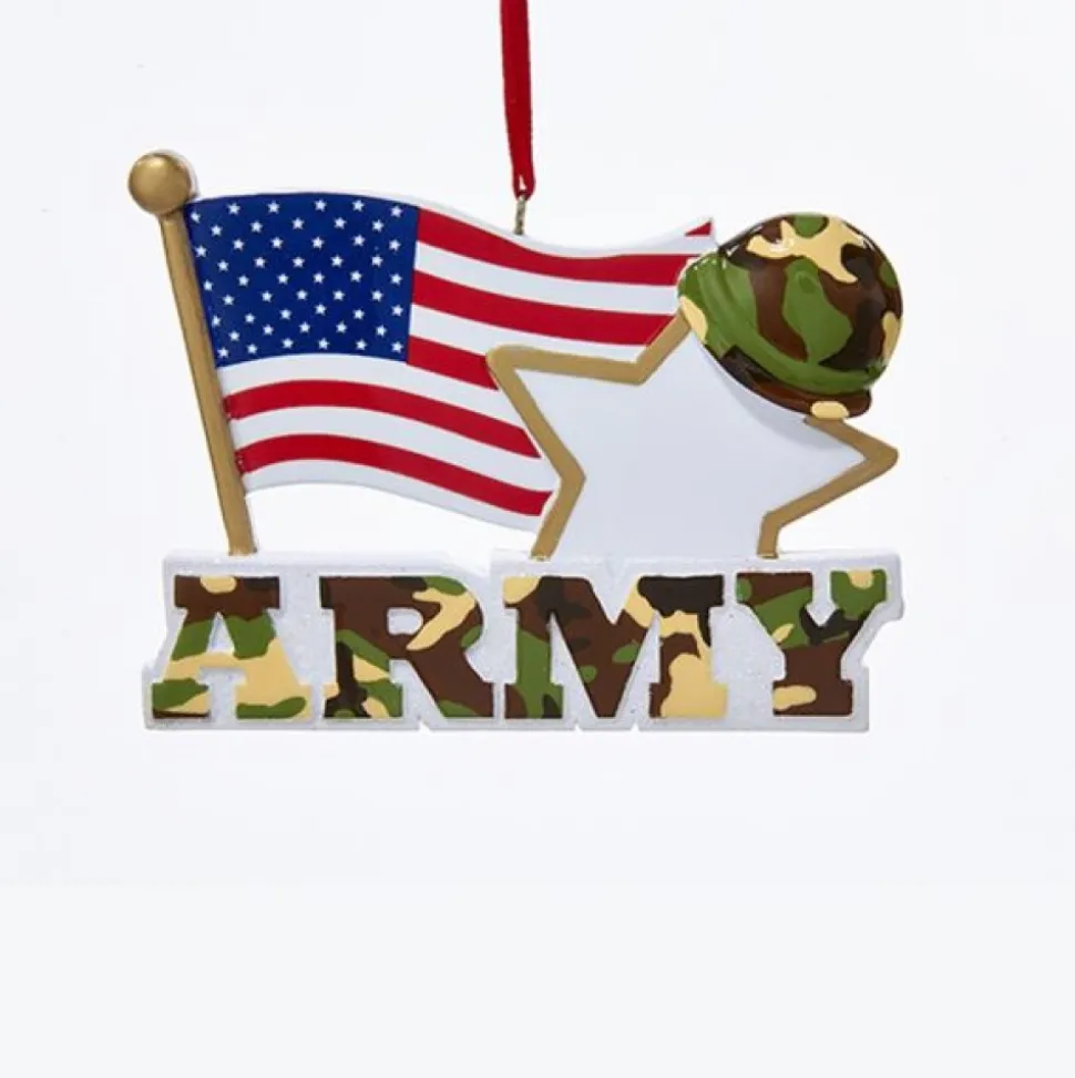 Army With American Flag Ornament For Personalization, Honor The Solider In Your Life This Holiday Season With This Army Ornament With The American Flag For Personalization From Kurt Adler. Features “Army” Written In Green, Brown, And Tan Camouflage With A Camouflage Helmet, And An American Flag In The Background. Retired