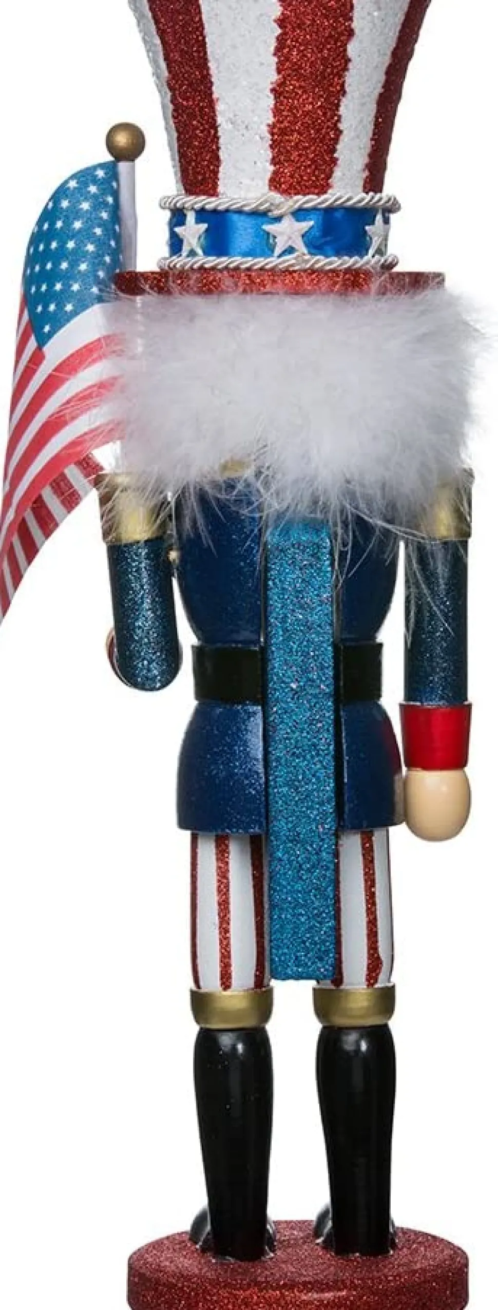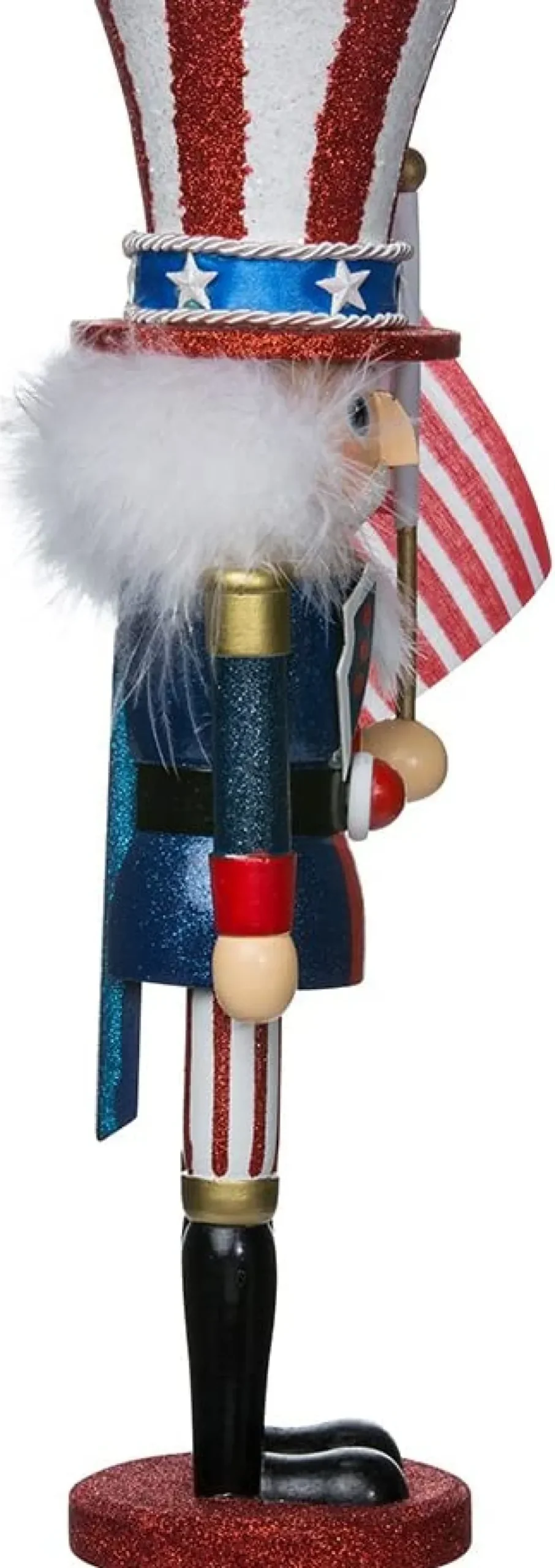 Hollywood 15″ Wooden Uncle Sam Nutcracker, Kurt Adler, Designed By Renowned Artist Holly Adler, This Nutcracker Is A Part Of The Hollywood Collection. This Hollywood Uncle Sam Nutcracker Is Wearing A Patriotic Red, White And Blue Uncle Sam-Inspired Outfit, Complete With An American Flag-Style Top Hat, And An American Flag In His Hand.