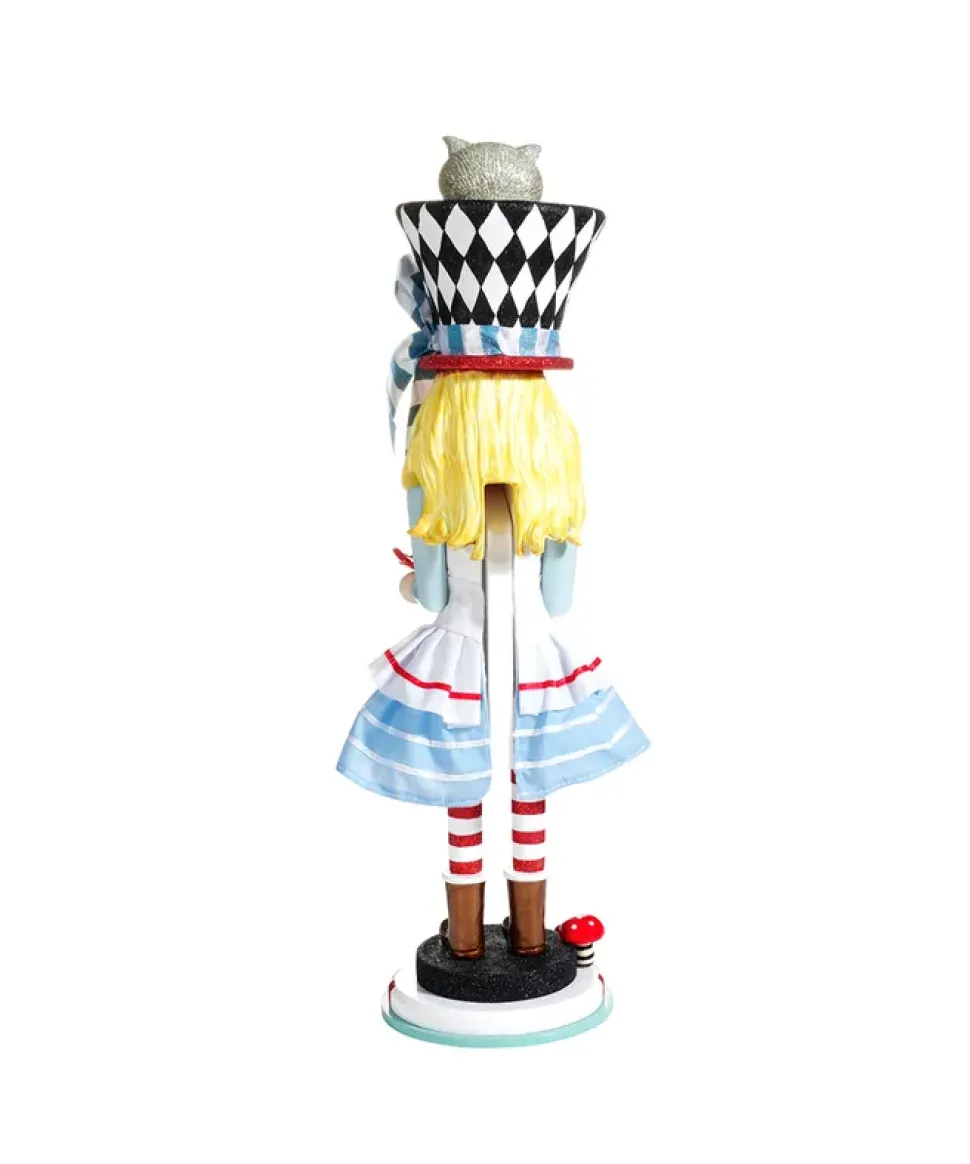 This Hollywood Nutcrackers™ Alice Nutcracker Is Inspired By Lewis Carroll’s 1865 Novel Alice’s Adventures In Wonderland. Alice Is Featured Here With A Tea Set And Topped Off With A Black-And-White Diamond Patterned Top Hat. Cheshire Cat Is Peeking Out Of The Hat.