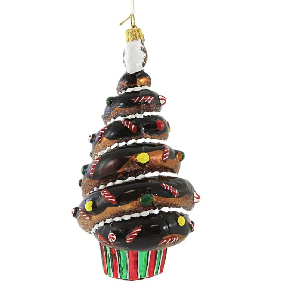 Huras, Chocolate Christmas Tree Sweets Pastry Cake, This Tasty Treat Of Swirled Chocolate Confection Is Iced In A Dark Glossy Cocoa With Iridescent Glitter Inside A Red And Green Striped Holder With A Gingerbread Tree Topper. Each Tier Is Decorated With Peppermint Swirled And Striped Treats And Solid Colored Candies. S641