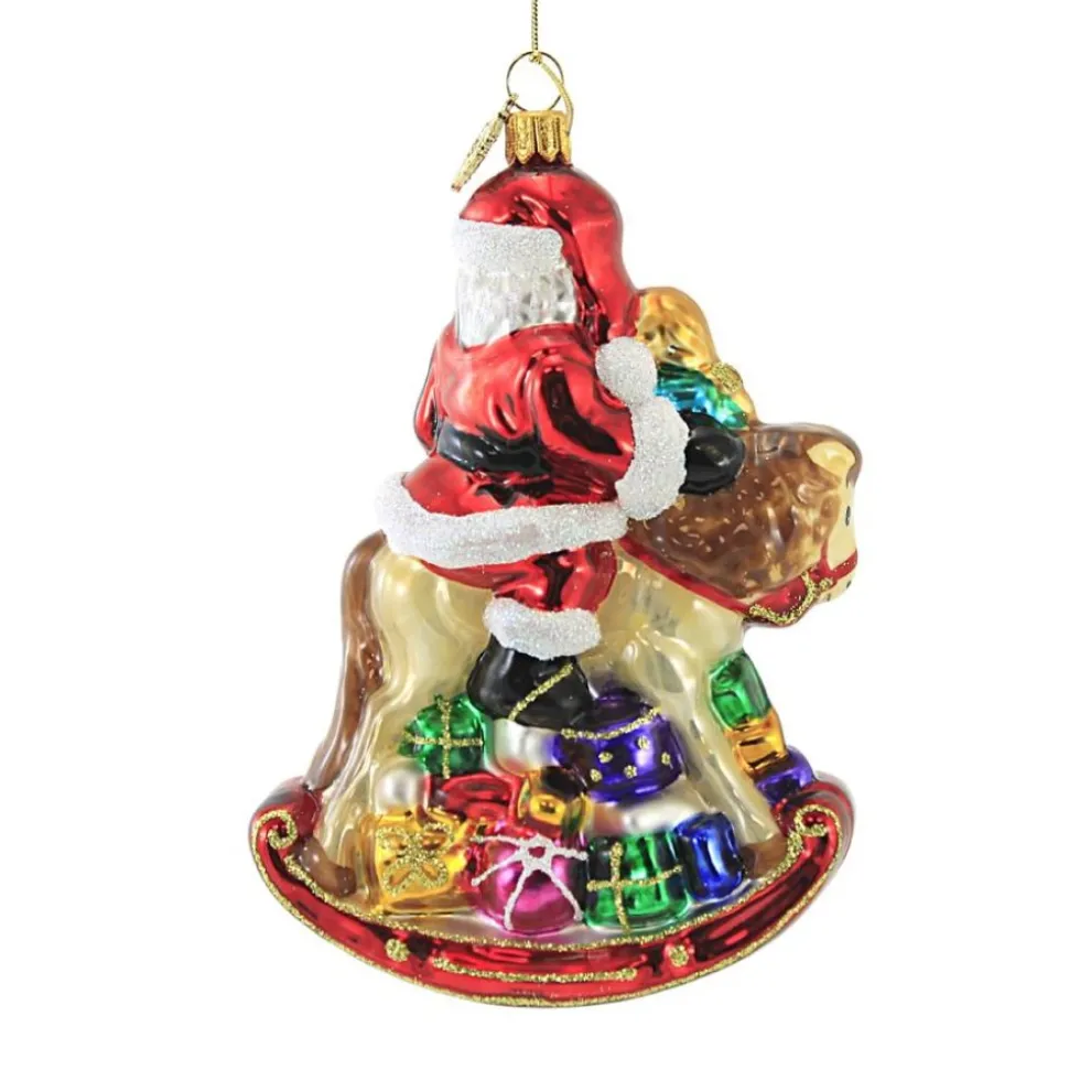 Huras, Santa On Rocking Horse, Doll Christmas, Santa In His His Traditional Christmas Attire, A Glossy Red Coat, Trousers And Stocking Cap Trimmed In White Superfine Glitter. His Black Boots Embellished With Gold And White Superfine Glitter Has The Good Girl On His Rocking Horse As One Of His Elves Snaps The Photo. The Rocking Is Surrounded With Colorful Hand-Painted Gifts With Glittered Details. Santa’s Beard Shimmers With White Superfine Glitter. S229