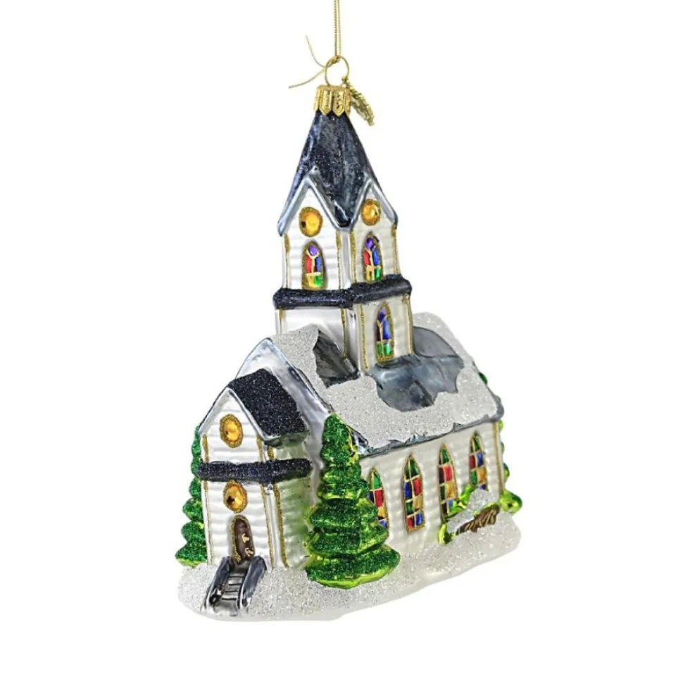 Huras, Stained Glass Window Church, Wedding Chapel, THe White Clapboard Is Hand-Painted In White With Multi-Colored Windows. Superfine White Glitter Blanket The Roof And Grounds Of This Sleepy Little Chapel. The Windows And Doors Have Gold Accents And The Green Trees Guarding The Entrance With Green Glittered Details. S665