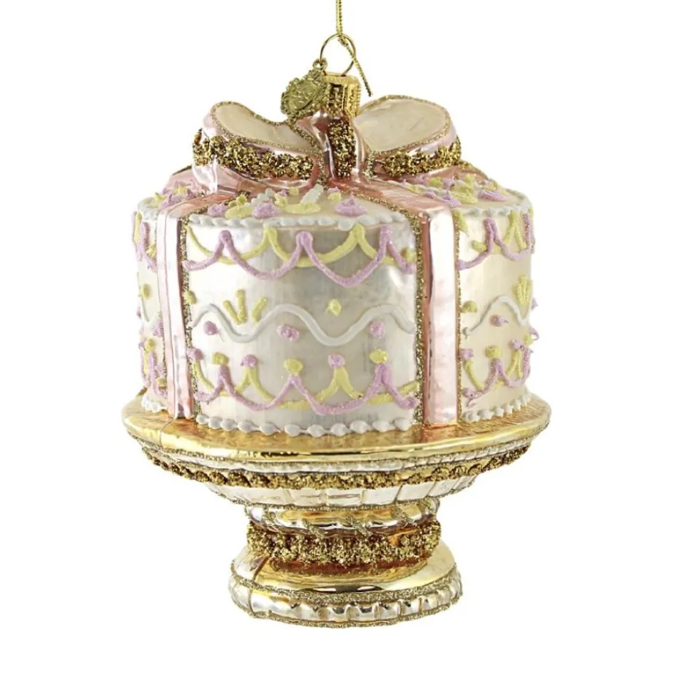 Huras, Wedding Cake, Glass Ornament, Immerse Yourself In A Truly Magical Sensation Of Holiday Magic With This Luxurious, Beautifully Designed Ornament From Poland. Decorate Or Gift Give This Holiday Season With Wedding Cake. A Single Tiered Wedding Cake With Ivory Icing With White, Yellow And Pick Decorative Detailing. A Glass Fondant Glossy Pink Bow With Gold Glitter Applique Wrap This Beautifully Detailed Wedding Cake. Pastry Bakery Marriage, S777