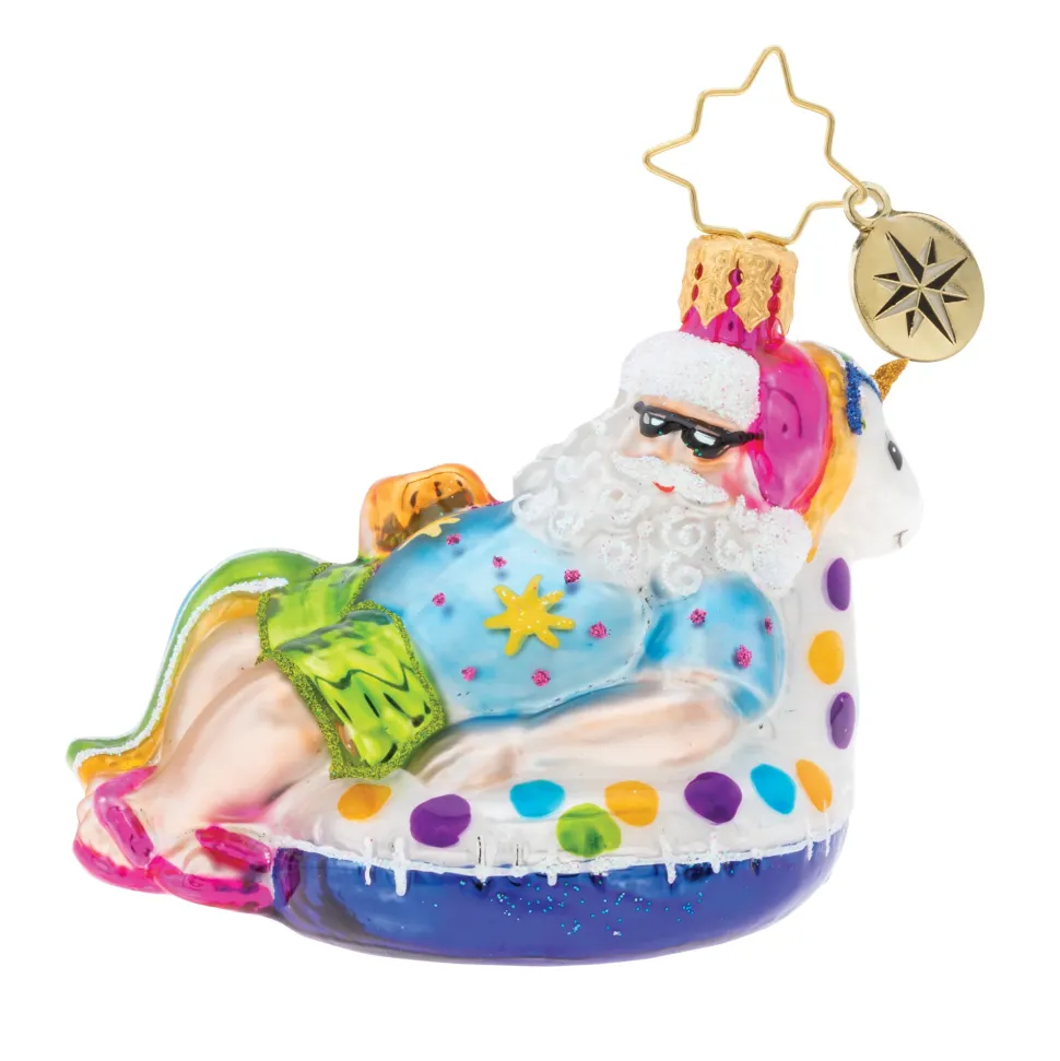 Radko, Floating Through The Holidays Gem, Kris Kringle Floats Around In Trendy Style On His Rainbow Unicorn Floaty, With A Cool Drink In Hand. What A Great Way To Cool Off This Holiday Season! 1019735