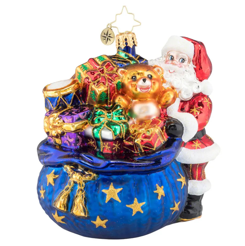 The Christopher Radko Santa’s Surprise Ornament Is Part Of The 2019 Santa Claus Collection. This Ornament Features A Jolly Santa With A Bag Of Overflowing Toys Featuring All The Christmas Favorites From A Cuddly Teddy Bear To A Drum And Plenty Of Wrapped Surprises.