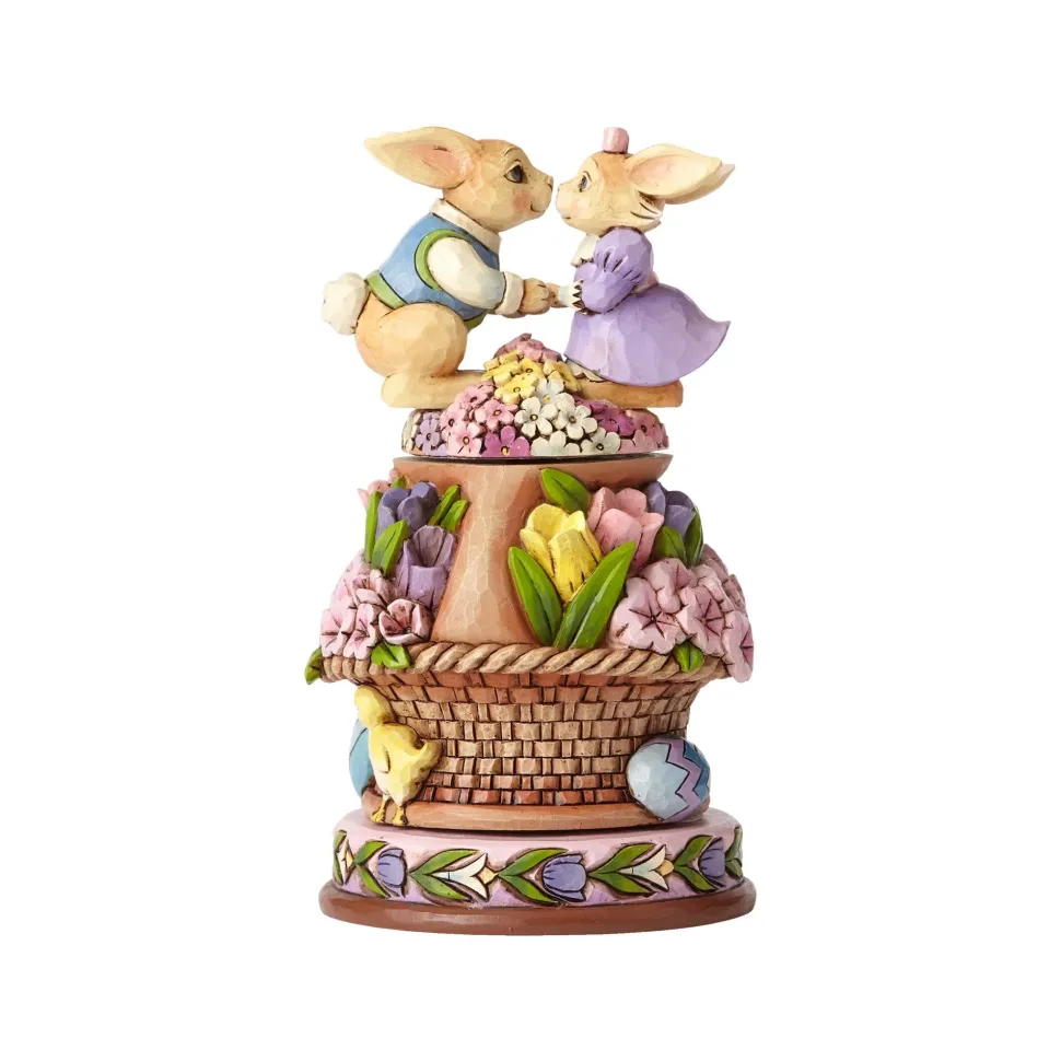 Bunnies With Rotatable Flowers, Beautifully Handcrafted In Exquisite Detail, This Kissing Bunnies Design Is A Colorful Easter Piece Decorated In The Unique Folk Art Style That Is Unmistakably Jim Shore. With A Gentle Touch Of The Hand, The Flower Scene Rotates Around The Basket.